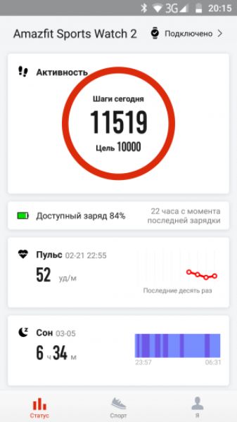 L'écran principal affiche les indicateurs actuels : le nombre de pas pour la journée en cours, la fréquence cardiaque et la durée du sommeil la nuit. Dans la catégorie suivante, il est possible d'étudier les statistiques des exercices et, à la fin, la troisième section concerne les paramètres de profil, le programme et l'Amazfit Watch 2 elle-même.