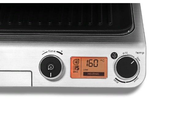 Der Temperaturregler und die Zeitschaltuhr sowie die Temperaturwähltasten von Celsius bis Fahrenheit befinden sich auf der rechten Seite neben dem LCD-Display, das den aktuellen Grillstatus, die Temperatur und die Zeitschaltuhrinformationen anzeigt.