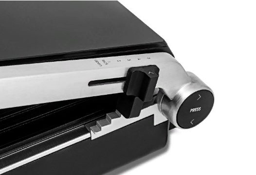 Auf der linken Seite der Vorderseite beider Oberflächen befinden sich die Bedienfeld-Freigabetasten. An der Seite befindet sich ein Knopf zum Ändern der Position des Grills und ein Verriegelungsschieber.