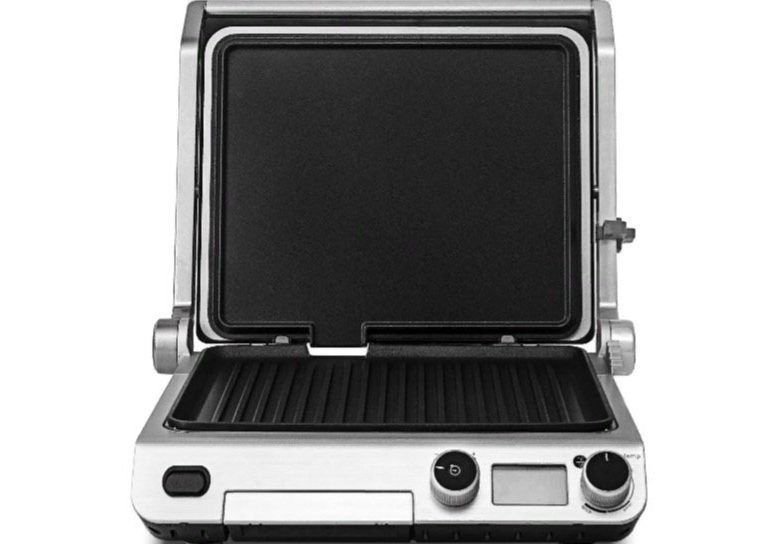 Das Design dieses Grillmodells ist streng und minimalistisch. Metallgehäuse und schwarze matte Kunststoffelemente. Die obere Platte hat ein spiegelschwarzes Finish. Die Bedienelemente befinden sich bequem auf der Vorderseite.