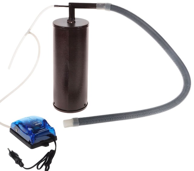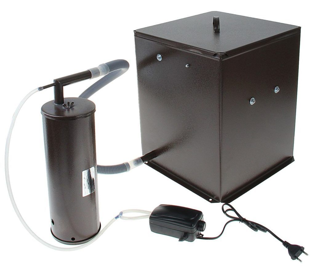 Das Lieferset enthält außerdem einen Luftkompressor, einen geriffelten Rauchschlauch, einen Silikonschlauch mit T-Stück, eine Haarnadel zum Aufhängen von Produkten in einer Menge von 4 Stück, eine Bedienungsanleitung und eine Garantiekarte.