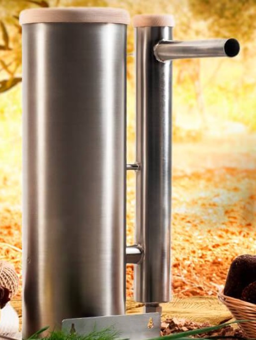 Ein Gerät für Einsteiger, mit einer einzigartigen Sammlung von Kondensat und Harz, die mit Holzspänen arbeitet. Dank des Reinigungssystems wird der Rauch auf jeder Ebene des Kühlers gereinigt und gekühlt (am Ausgang ist er sauber, ohne Ruß und Ruß). Dieses Modell selbst hält die gewünschte Räuchertemperatur (20 Grad Celsius) aufrecht, in Verbindung damit ist die autonome Räucherzeit nicht begrenzt.