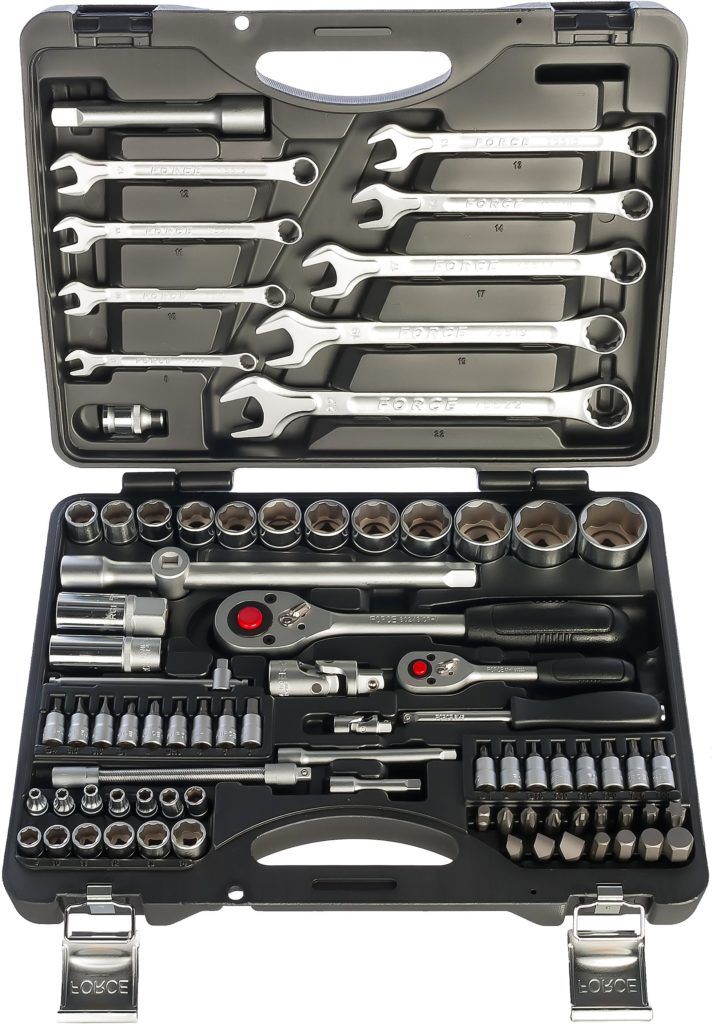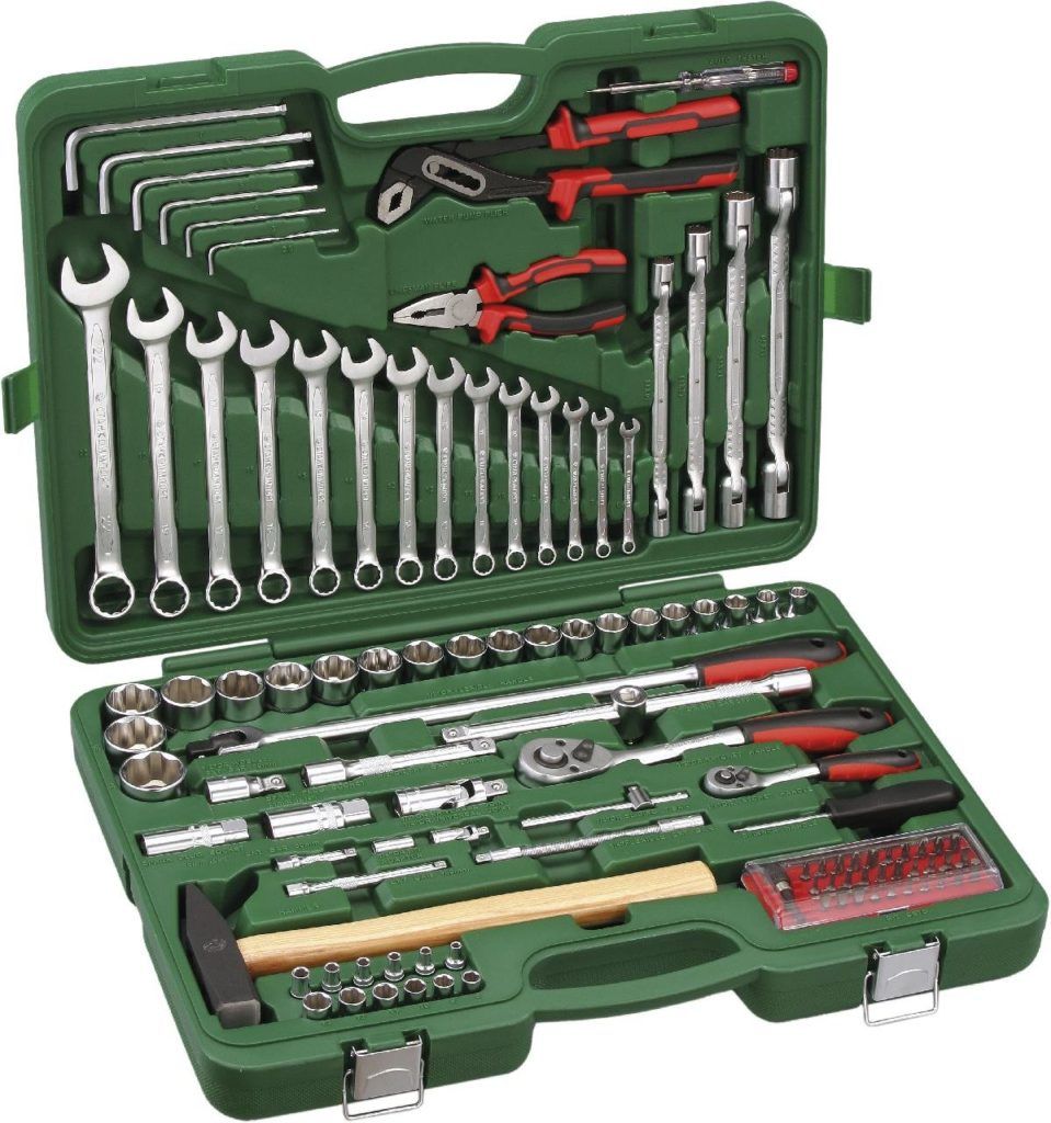 Es zeigte sich gut an kleinen Servicestationen sowie bei Reparaturen zu Hause oder im Feld. Bezieht sich auf Sets im mittleren Preissegment. Auch hier ist das gesamte Werkzeug aus hochfesten Materialien gefertigt. Chrom-Vanadium-Stahl gilt als sehr starke Legierung, die nicht rostet. Ratschen sind mit einem sehr zuverlässigen Mechanismus ausgestattet. Verfügt über eine große Auswahl an Ringmaulschlüsseln und Stecknüssen. Es kann zu einem Preis von ca. 8.000 Rubel erworben werden.