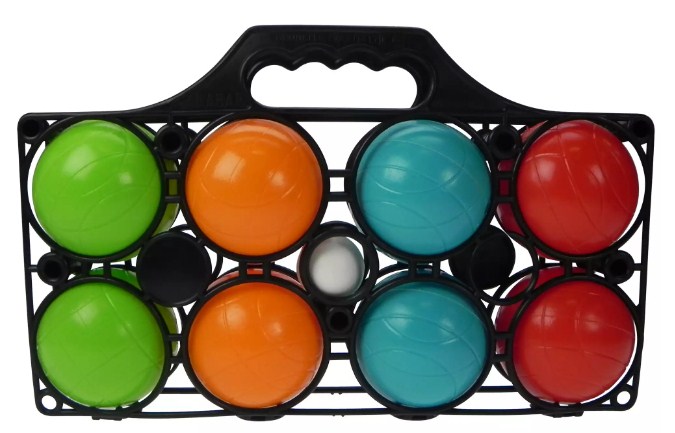 Dieser chinesische Hersteller bietet ein Set mit 8 Petanque-Kugeln an. Das Set ist für Kinder ab 3 Jahren zum Spielen konzipiert. Alle Geschosse sind aus Kunststoff. Der Durchmesser der großen beträgt 7 cm, das Kochonnet 3,5 cm und ist zur besseren Standfestigkeit mit Wasser gefüllt. Große sind in 4 Farben bemalt - gelb, grün, blau und rot. Sie haben alle das gleiche Kerbmuster. Das Set ist in einer Art Plastikkoffer-Behälter verpackt.