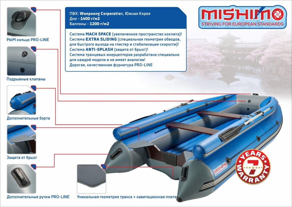 MISHIMO LITE 335 ist ein traditionelles Niederdruck-Schlauchboot. Für seine Herstellung wird hochwertiger Wonpoong-Stoff (Korea) verwendet. Dieses Material ist sehr langlebig, sodass es auch nach vielen Jahren aktiver Nutzung sein ursprüngliches Aussehen behält. Auch Bootszubehör hebt sich durch hohe Zuverlässigkeit und lange Lebensdauer von der Konkurrenz ab. Der Hersteller kauft es von PRO-LINE (Vereinigte Staaten von Amerika), einem der führenden Unternehmen auf dem Weltmarkt. Das Trockengewicht des Modells beträgt 33 kg und die Tragfähigkeit 480 kg. Die maximale Leistung des Motors in diesem Boot beträgt 10 PS. Mit.