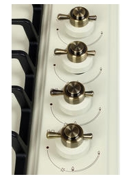 Das Gaskochfeld wird von Reglern gesteuert. Der Einfachheit halber ist eine elektrische Zündfunktion vorgesehen. Die Brenner werden wie folgt nach Leistung verteilt - zwei mit 1800 W, Einkreis; ein - 1000 W, Einkreis und 3400 W - Zweikreis.