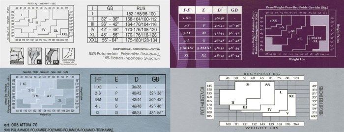 Außerdem hat jede Packung mit Strumpfhosen eine eigene Größentabelle auf der Rückseite. Es ist einfach zu navigieren und ein Produkt auszuwählen, das perfekt zur Figur passt. Bei der Auswahl eines Produkts für die Größe sollten Sie nicht versuchen, Strumpfhosen kleiner zu kaufen, als Sie benötigen. Dadurch rutschen, quetschen oder reißen sie schnell.
