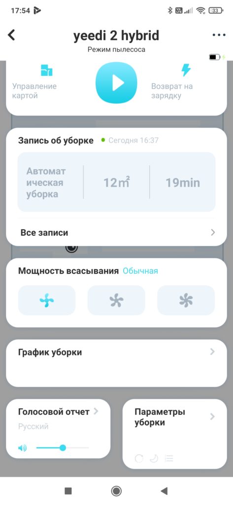 In einem Raum mit Hindernissen umgeht das Gerät zunächst den gesamten verfügbaren Bereich mit einer Schlange und umgeht dann den Raum erneut um den Umfang herum und folgt der Basis. Die Navigation ist großartig. Für die Reinigung von 34 qm. m., die der Roboter als 29 identifizierte, dauerte 41 Minuten. Das Modell ist nicht schnell, aber auch nicht langsam. Ihre Geschwindigkeit ist im Allgemeinen durchschnittlich. Hauptsache, das Gadget hinterlässt keine ungereinigten Bereiche und baut auch eine Karte perfekt auf.