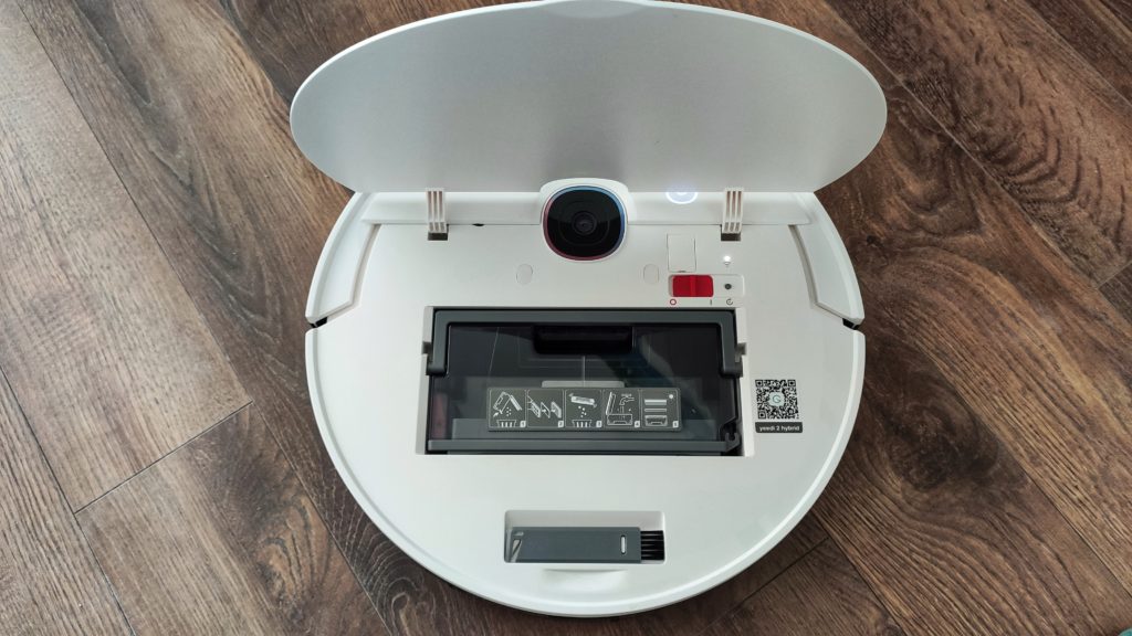 Oben gibt es eine Taste zum Aktivieren der Reinigung im automatischen Modus, eine Kamera und eine Abdeckung. Darunter befindet sich ein Mülleimer, eine Reinigungsbürste, ein QR-Code zum Installieren von Software, ein Netzschalter und ein physischer Schlüssel zum Verbinden mit Wi-Fi.