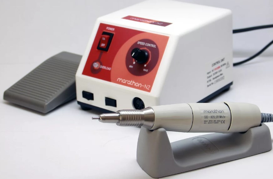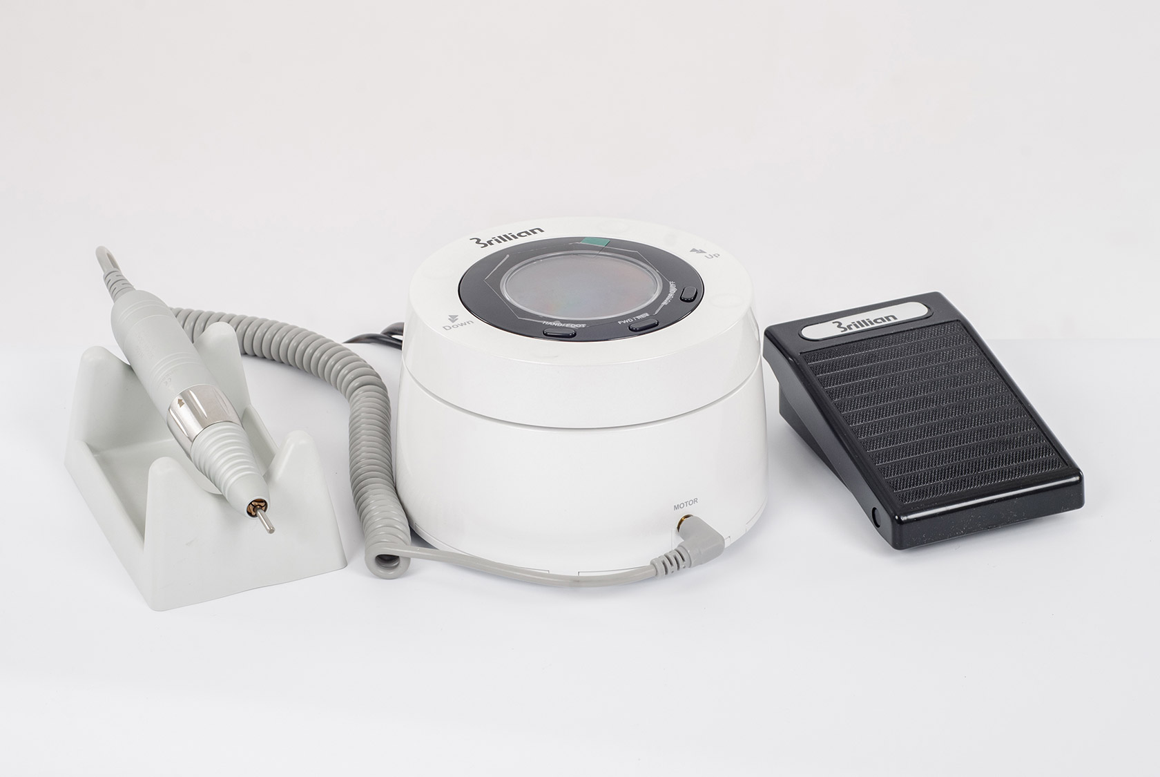Eines der neusten Geräte kommt noch aus Südkorea. Ins Auge fällt ein interessantes und stylisches Gehäusedesign, das sich kategorisch von allen bisherigen Modellen unterscheidet. Ein weiterer wesentlicher Unterschied ist das bürstenlose Design des Mikromotors des Handstücks, das den Verschleiß seiner Komponenten eliminiert und seine Lebensdauer erheblich verlängert. Bei anderen technischen Merkmalen fällt dieses Modell nicht besonders auf: Die Leistung beträgt 65 W, die Anzahl der Umdrehungen pro Minute beträgt 30.000.Am Körper befindet sich ein rundes Display, das den Betriebsmodus des Werkzeugs anzeigt. Die Maschine kann im manuellen und im Fußmodus arbeiten, für den zweiten ist ein Pedal im Kit enthalten.