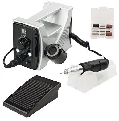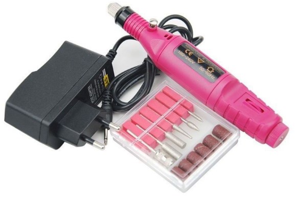 Günstiges Mini-Gerät für Maniküre und Pediküre, betrieben mit Haushaltsstrom. In China hergestellt. Trotz seiner geringen Abmessungen (Gewicht - ca. 150 g) hat es gute technische Eigenschaften: Leistung 50-60 W, Drehzahl bis zu 20.000 Umdrehungen / min. Der Grifffräser ist mit einem Drehzahlregler ausgestattet. Überraschend ist auch die gute Ausstattung: Im Kit sind 6 Diamant- und 6 Schleifdüsen enthalten.In Anbetracht dessen können wir mit Sicherheit sagen, dass dieses Werkzeug perfekt für die Maniküre, einfache Pediküre sowie die Korrektur verlängerter Nägel geeignet ist.