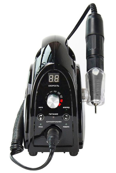 Ein weiteres professionelles Gerät aus Südkorea. Im Vergleich zu ähnlichen Werkzeugen fällt es durch die Verarbeitungsqualität und die Sorgfalt jedes Details auf. Der Griff aus strapazierfähigem Kunststoff mit gummierten Einlagen liegt angenehm in der Hand und rutscht beim Arbeiten nicht ab. Es hat zwei Ständer - in Form eines Glases und horizontal. Alle Schalter befinden sich auf der Frontplatte des Gehäuses: Ein / Aus, Geschwindigkeit, Betriebsarten, Rückwärtsgang. Das Gerät hat eine hohe Leistung von 100 W, was den Einsatz in Salons mit konstantem Kundenstrom ermöglicht.Die Rotationsgeschwindigkeit beträgt bis zu 40.000 Umdrehungen / min, was für eine hochwertige Pediküre ausreicht. Die Betriebsart ist direkt und rückwärts möglich. Mit dem im Bausatz enthaltenen Pedal lässt sich die Drehzahl stufenlos regulieren, was für den Meister, der beide Hände frei hat, sehr praktisch ist.