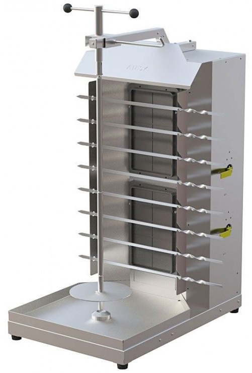Die Installation mit einem manuellen Antrieb aus lebensmittelechtem Edelstahl ermöglicht es Ihnen, nicht nur Schawarma, sondern auch Schaschlik zuzubereiten. Dazu verfügt das Gerät über einen Spieß für große Fleischstücke, der sich vertikal vor den Heizelementen dreht, und über spezielle Löcher für Grillstifte (horizontal angeordnet). Zwei Heizstäbe werden unabhängig voneinander geregelt und sparen so bei wenigen Abnehmern Gasverbrauch.