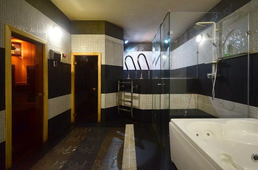 Sauna mit verschiedenen Arten von Dampfbädern - Russisch, Türkisch, Finnisch und Infrarot. Für Kunden wird eine Reihe zusätzlicher Dienstleistungen mit einer großen Auswahl an Spa-Behandlungen und Massagen angeboten. Es gibt einen großen Swimmingpool mit Kaminzimmer und einen Ruheraum, in dem Sie sich zwischen den Besuchen im Dampfbad entspannen können. Für diejenigen, die gerne ins eiskalte Wasser eintauchen, gibt es eine Fontäne, und für diejenigen, die es weicher mögen, gibt es eine Hydromassage.