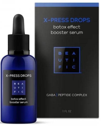 Dieses Booster-Serum mit der Wirkung von Botox von der russischen Firma "Beautific". Die Formel dieses Tools wurde speziell entwickelt, um Mimikfalten loszuwerden. Mit "X-press Drops Botox Effect Booster Serum" können Sie all Ihre Emotionen ausdrücken und sich keine Gedanken über das Auftreten von Falten machen. Dieser Effekt wird durch die Verwendung eines neuen kosmetischen Inhaltsstoffs GABA erreicht, der ein würdiger Ersatz für Botox ist. Säure, die in die Haut eindringt, sorgt für Muskelentspannung, danach werden Falten geglättet. Die Zusammensetzung enthält auch eine Gruppe von Matrixyl 3000-Peptiden, sie haben die höchstmögliche Konzentration und mit ihrer Hilfe wird die Haut in einem Monat elastisch. Auch in der Zusammensetzung ist Hyaluronsäure enthalten, mit Hilfe dieser Komponente gleicht die Epidermis den Feuchtigkeitsmangel aus, wodurch der Alterungsprozess gehemmt wird, die Haut Feuchtigkeit und Ernährung erhält.
