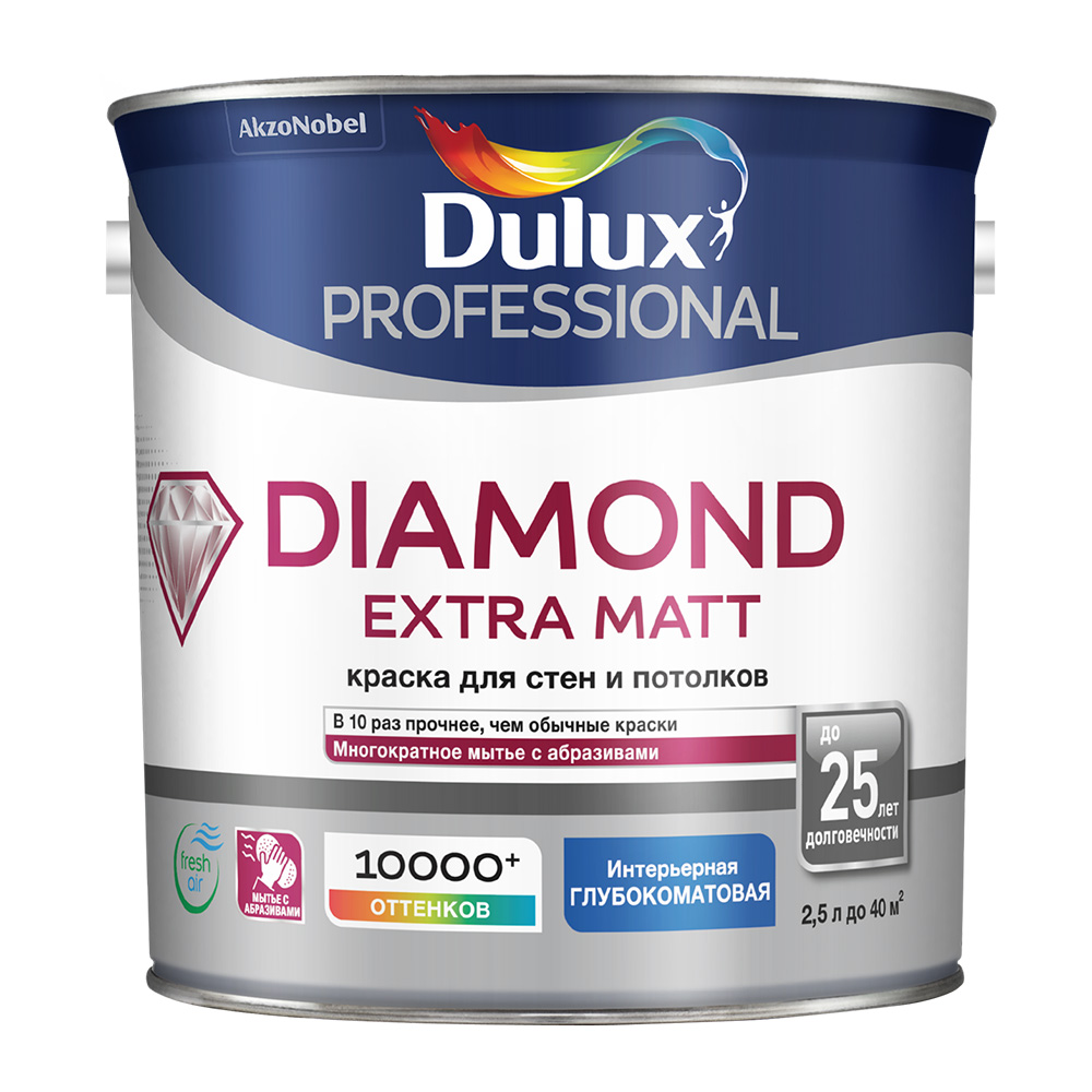 Matte Wasserdispersionsfarbe ist zum Auftragen auf Decken und Wände bestimmt. DULUX Trade Diamond Matt ist einfach in der Anwendung und sparsam in der Verarbeitung und erzeugt eine starke und dauerhafte Beschichtung. Geeignet für Räume mit mäßiger Luftfeuchtigkeit, kann auf Trockenbauwänden, Tapeten zum Streichen, Ziegeln, Putz und sogar Beton verwendet werden.