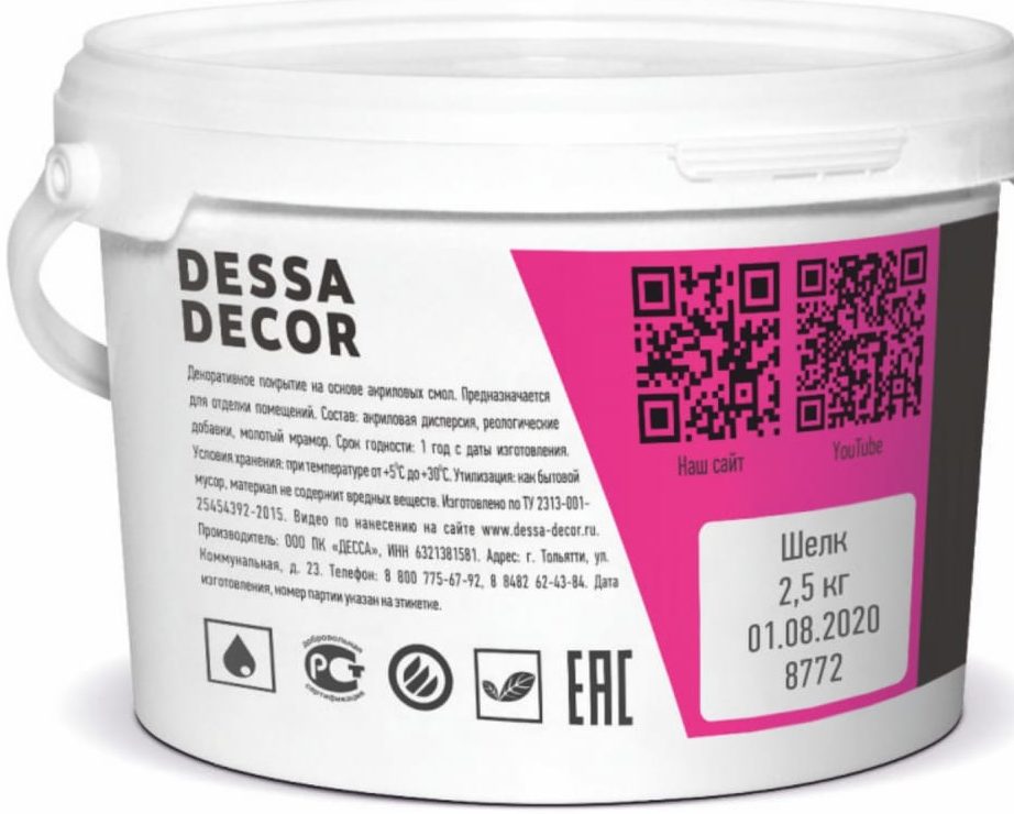 DESSA DECOR Silk Light hat eine Acrylbasis, die Originalfarbe ist Silber, kann aber durch Farben ersetzt werden. Für Wände und Decken geeignet, Tapeten können überzogen werden. Es ist auch möglich, in Räumen mit hoher Luftfeuchtigkeit aufzutragen, jedoch nach dem Lackieren darüber.Die Verwendung der Mischung ist einfach, aber Sie müssen zuerst die Flugzeuge vorbereiten, sie müssen gleichmäßig und gespachtelt sein, damit alle Schichten gleichmäßig aufliegen.