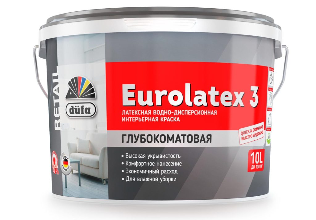 Latexfarbe DUFA RETAIL EUROLATEX 3 eignet sich für die Innendekoration aller Arten von Wänden, jedoch nur für Räume mit mäßiger Luftfeuchtigkeit. Auch zum Streichen von Papier- und Vinyltapeten geeignet. Nach dem Trocknen wird die Beschichtung matt und verbirgt perfekt alle kleinen Mängel. Es dauert drei Tage, bis die Zusammensetzung vollständig getrocknet ist. Das Produkt wird in Russland hergestellt.