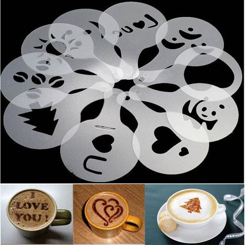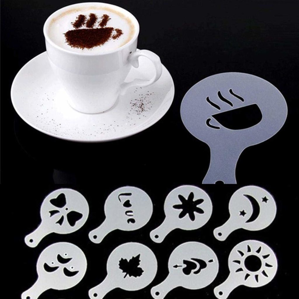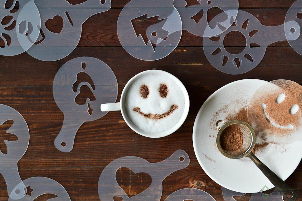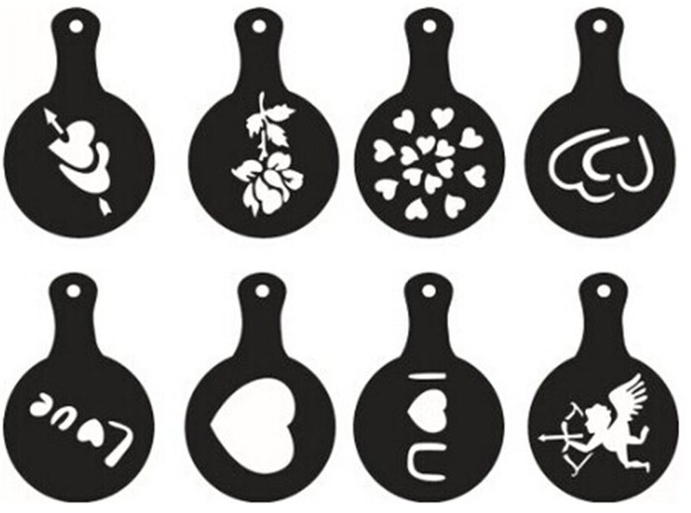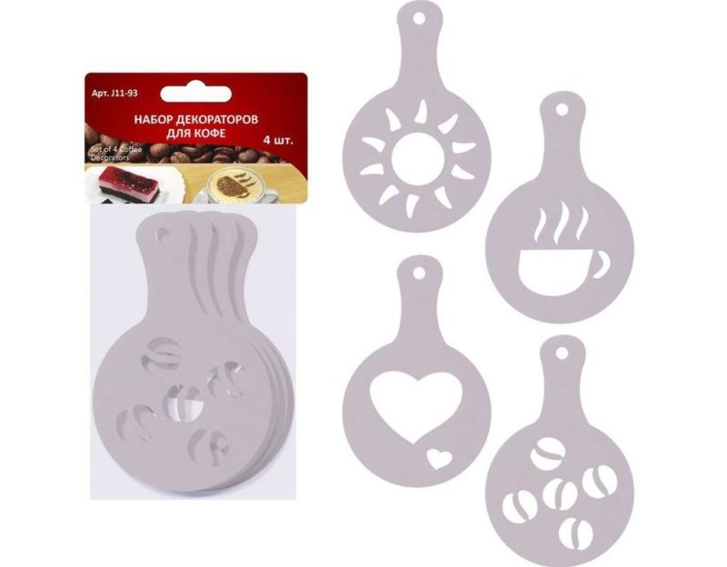 Set zum Dekorieren von Cappuccino. Die Schablonen bestehen aus dickem Kunststoff, sodass das Bild klar ist. Außerdem halten diese Dekorateure lange. Der einzige Nachteil ist, dass der Durchmesser des Bildes etwa 5 cm beträgt, sodass Sie nach einer größeren Tasse suchen müssen.Laut Erfahrungsberichten von Nutzern eignen sich Schablonen perfekt zum Dekorieren von süßen Aufläufen oder Gebäck.