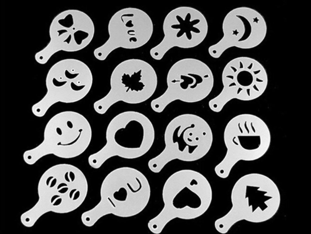 Eigentlich nur eine Schablone - ein Kunststoff- oder Stahlkreis mit einem Griffhalter und einem in der Mitte geprägten Bild. Normalerweise sind dies Emoticons, Blumenblätter, Herzen, Tierkonturen, wie jedermanns Lieblingspandas. Zum Dekorieren von Kaffee passt auch ein Süßwarendekorateur (zum Dekorieren von Kuchen und Gebäck) mit kleinem Durchmesser und einem Muster ohne kleine Details. Auf Wunsch können Sie anstelle einer gekauften Schablone ein Blatt Normalpapier mit einem entlang der Kontur ausgeschnittenen Bild verwenden.