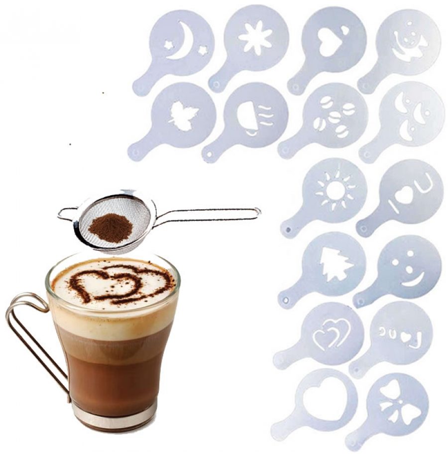 16 Dekorateure mit verschiedenen Bildern zum Dekorieren von Kaffee. Die Qualität des Kunststoffs ist nicht schlecht, Schablonen können bedenkenlos in die Spülmaschine gegeben werden. Von den Minuspunkten - kleine Details. Wenn Sie also ein Muster mit klaren Umrissen erzielen möchten, verwenden Sie fein gemahlenes Zimt- oder Kakaopulver. Und ja, für eine gleichmäßige Verteilung ist es besser, ein Sieb zu verwenden.