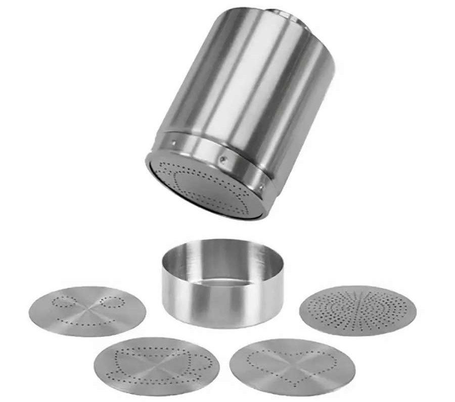 Es gibt auch Modelle mit Shaker, in denen eine austauschbare Düsenschablone aus Kunststoff installiert ist (im Wesentlichen eine Platte mit Löchern, die den Umriss des Bildes umreißen). Solche Geräte sind auch aus Stahl, sie haben ein größeres Volumen (100-300 ml) und es ist einfacher, solche Shaker zu verwenden. Kein verschüttetes Zimt- oder Schokoladenpulver. Der einzige Nachteil ist, dass Sie damit keine komplexen Zeichnungen erstellen können.