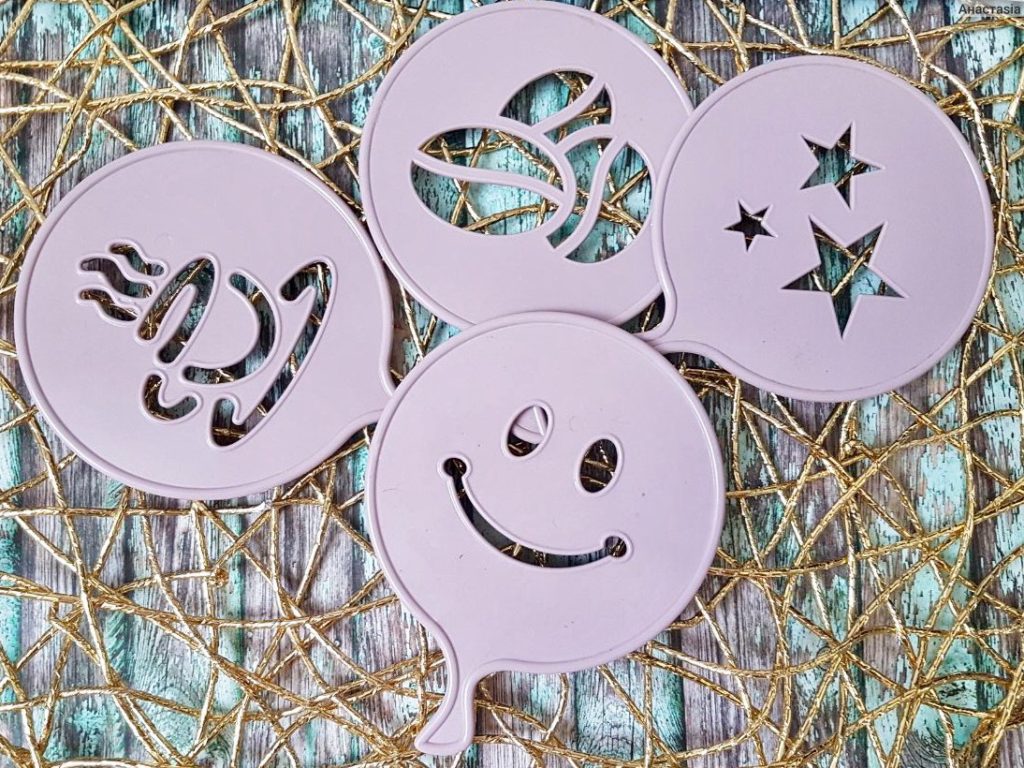 Ein Satz von 4 Schablonen aus sicherem Kunststoff mit einem bequemen Griff. Geeignet für Kaffee und zum Dekorieren von Gebäck. Es ist einfach zu bedienen, Hauptsache, der Schaum ist dicht genug, sonst können Sie anstelle eines klaren Musters einen Fleck bekommen.