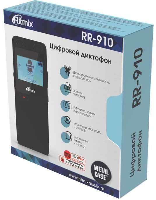 Das kompakte Diktiergerät mit Abmessungen von 104 x 41 x 11 mm und der Wiedergabe von Stereoton ist mit zwei eingebauten Mikrofonen von ausgezeichneter Qualität ausgestattet. Das Gerät arbeitet in zwei Tonaufnahmemodi MP3 und PCM (WAV) und kann mehrere Audioformate abspielen: MP3, WMA, DRM WMA, OGG, APE, FLAC, WAV, AAC-LC, ACELP, Audible. Je nach Version verfügt Ritmix RR-910 über einen integrierten Speicher von 4 GB und 8 GB und bietet auch die Möglichkeit, MicroSD (bis zu 32 GB) anzuschließen. Das vorgestellte Modell ist mit einem UKW-Tuner, zwei 3,5-mm-Klinkenbuchsen und einem Micro-USB-Eingang ausgestattet.