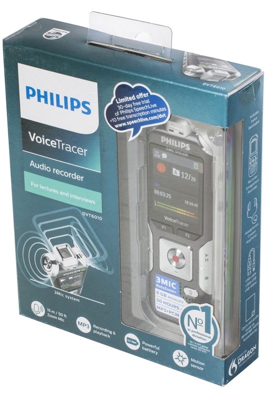 Es ist nicht schwierig, den Rekorder zu steuern, alle Informationen werden auf einem großen LCD-Display in russischer Sprache eingegeben. Die intuitive Benutzeroberfläche unterstützt zudem acht Sprachen und sorgt für eine einfache, intuitive Bedienung. Der Rekorder ist mit einem internen Speicher von 8 GB ausgestattet, der die Sicherheit von Toninformationen für bis zu zwei Kalendermonate (2280 Stunden) gewährleistet. Mit dem tragbaren Recorder DVT6010 von Philips können Sie auch einen externen Speicher verwenden, indem Sie ihn an einen separaten microSD-Kartensteckplatz mit einer maximalen Kapazität von 32 GB anschließen.