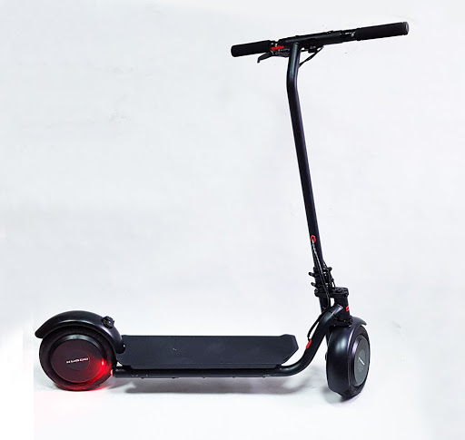 Es unterscheidet sich von einem herkömmlichen Roller durch das Vorhandensein eines Elektromotors im Hinterrad. Die gesamte technische Füllung ist in der unteren Plattform versteckt, und die Fußbremse ist ähnlich wie beim Auto.
