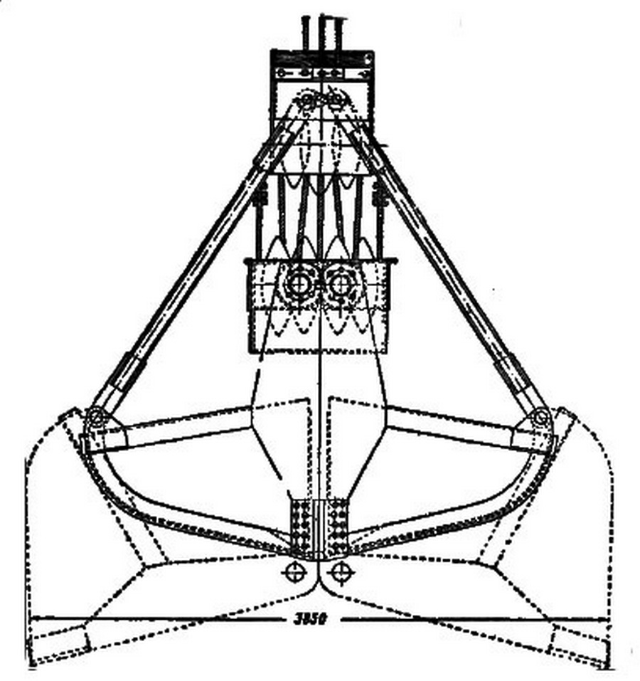 Ein weiteres Modell eines verstärkten Greifers aus dem russischen Wolga-Vyatka Mechanical Plant. Entwickelt für den Transport von Schüttgütern - Klinker, Kalkstein, nasser Sand, Hüttenschlacke.Die Verwendung von vier Seilen im System erhöht die Lebensdauer erheblich, während die beim Greifen erzeugte Kraft um das Vierfache erhöht wird.