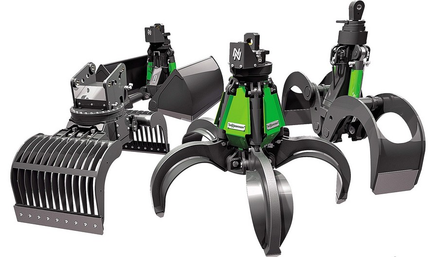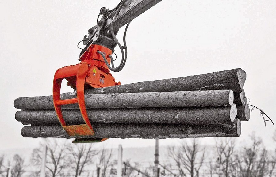 Greifgeräte können mit Baggern, Ladern sowie Kränen ausgestattet werden - Greifer werden an ihrem Hubausleger installiert.