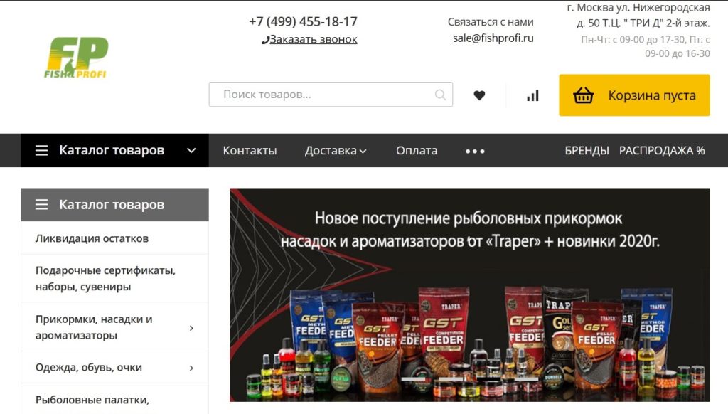 Der FishProfi Onlineshop für Angelzubehör zeichnet sich durch sein Rabattsystem und ein Sparprogramm für Stammkunden aus. Die Website präsentiert Waren von russischen und europäischen Herstellern wie Pelican, Gut-mix, Zemex, Marukyu und anderen Marken aus England, Frankreich, Italien, Polen, Belgien und Deutschland. Folgende Produktkategorien stehen zur Auswahl: