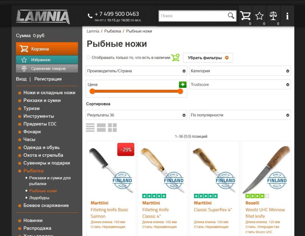 Lamnia ist ein finnischer Online-Shop für Angelzubehör sowie Zubehör für Jagd, Schießen, Outdoor-Aktivitäten und Tourismus.Die Site-Oberfläche unterstützt mehrere Sprachen - Russisch, Englisch, Deutsch, Französisch, Spanisch, Norwegisch, Schwedisch und andere. Den Käufern wird eine breite Palette verschiedener Zubehörteile angeboten, mit denen Sie Ihre Erholung im Freien sicher und bequem verbringen können: