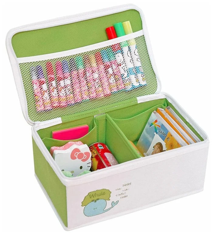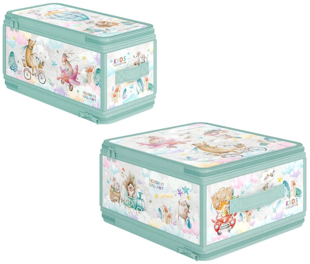 Das Modell verfügt über einen Klappdeckel mit zwei seitlichen Griffen, die ein schnelles und bequemes Verschieben des Organizers ermöglichen.Dem Baby wird das originelle Design des Produkts sicherlich gefallen und es wird seine Lieblingssachen gerne in diesem persönlichen Versteck aufbewahren. Eine solche Entscheidung hilft schon in jungen Jahren, dem Kind beizubringen, die Ordnung wiederherzustellen.