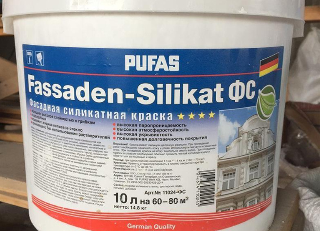Hersteller: LLC LINIE KRASOK LINIE FARBE. Acryl-Silikon-Emulsion, geeignet für den Außen- und Innenbereich.Arbeitsflächen: Beton, Holz, Ziegel, Putz. Kosten: 2350 Rubel.