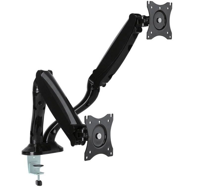 Der chinesische Halter zeichnet sich durch die Möglichkeit aus, 2 Monitore zu installieren. Der Durchschnittspreis liegt bei 3,9 Tausend Rubel, die Tragfähigkeit beträgt bis zu 7 kg pro Fach (insgesamt bis zu 14 kg). Durchdachtes Design passt in moderne Interieurs, wie High-Tech. Die vertikale Befestigung von Bildschirmen ist zulässig, Befestigungselemente sind Standard. Laut Bewertungen sind die Kabelfächer am erfolgreichsten und nehmen sowohl dicke als auch dünne Drähte auf. Das Produkt ist beliebt bei Benutzern, deren Arbeit die Verwendung von 2 Monitoren beinhaltet.