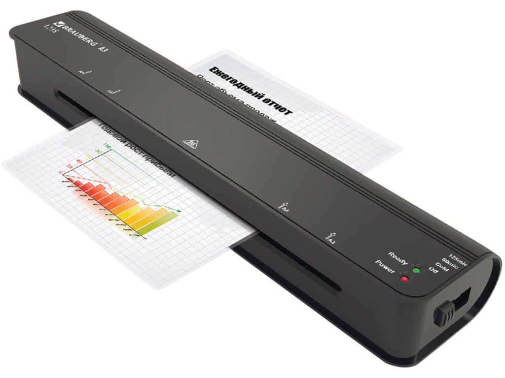 Ein weiteres Kleinpaket-Laminiergerät, das sich perfekt für Büroarbeiten eignet. Der äußere Teil des Geräts ist mit einem Bedienfeld ausgestattet, mit dem Sie bei Bedarf die Dicke des Pakets einstellen können. Es gibt ein Signal, das Sie über die Arbeitsbereitschaft informiert und warnt, dass sich das Paket in der falschen Position befindet. Die meisten Funktionen sind jedoch im Automatikmodus eingestellt, z. B. bestimmt das Gerät selbst die gewünschte Dicke des Arbeitsmaterials, schaltet bei Bedarf die Umkehroption ein, stellt die Temperatur und Geschwindigkeit des Filmauftrags ein und schaltet sich bei Bedarf automatisch aus Ausfallzeit.Die maximale Größe der beschichteten Oberfläche darf A 3 nicht überschreiten, und die Dicke des aufgetragenen Films variiert zwischen 75 und 250 Mikron. Die Maschine erwärmt sich in einer Minute auf den Betriebszustand und bearbeitet die maximal zulässige Fläche in 20 Sekunden.