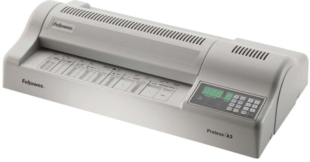 Ein ausgezeichneter Laminator, mit dem Sie bis zu 100 Blätter in Formaten bis zu A3 pro Tag verarbeiten können, die Heizrate beträgt weniger als eine Minute, die Abdeckungsfläche beträgt 1 Meter pro Minute. Unter dem Körper des Geräts sind 6 Wellen verborgen, die für eine gleichmäßige Erwärmung und eine hochwertige Polyethylenanwendung sorgen, und über das vorhandene Bedienfeld können Sie die gewünschte Temperatur und Geschwindigkeit einstellen. Filmdicke von 75 bis 250 Mikron ist für die Arbeit geeignet. Trotz der hohen Qualität der Produkte erfordert Fellowes Proteus keine besonderen Fähigkeiten, um zu arbeiten, und daher kann auch ein Anfänger damit umgehen.