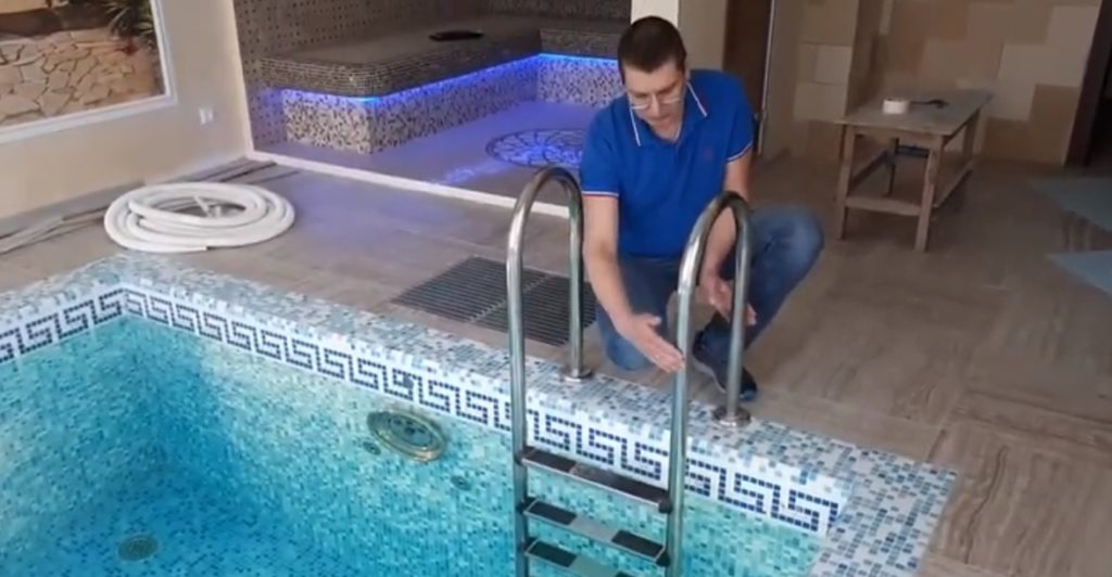 Um in den Pool hinabzusteigen, benötigen Sie eine zuverlässige Leiter. Edelstahlprodukt geeignet für eingelassene Schwimmbecken. Die Anzahl der Stufen sollte entsprechend der Tiefe des Tanks gewählt werden. Gefragt ist ein 2-Stufen-Modell, das in Container mit Schmalseiten eingebaut wird. Es wird in einem Abstand von 16 cm von der Plattenkante befestigt.