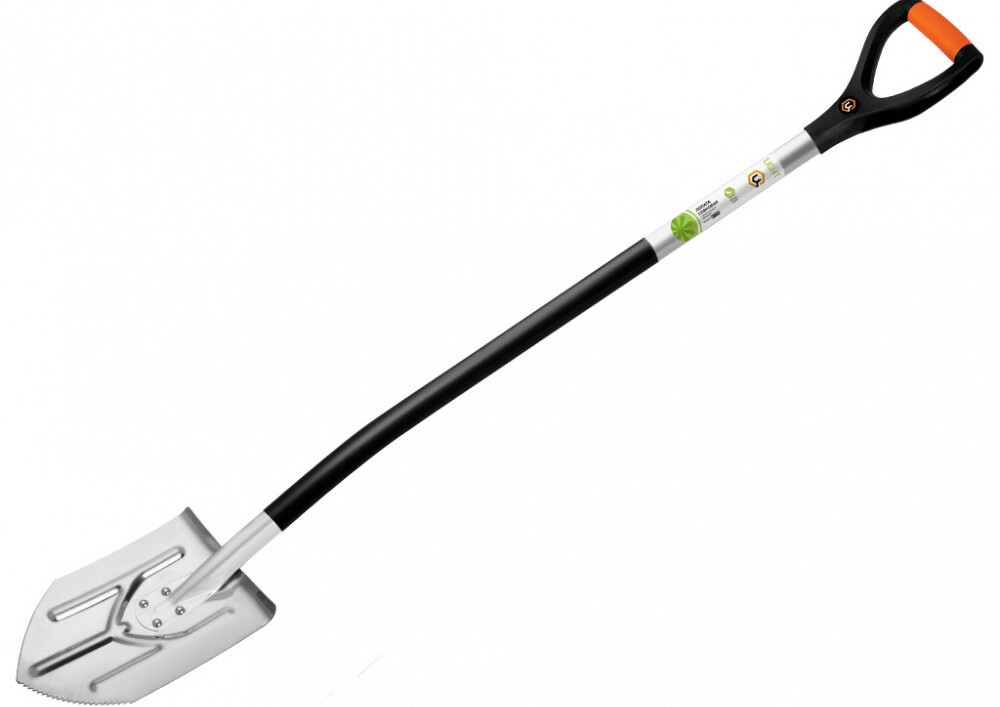 Die spezielle Form der Klinge ist speziell für das Graben der Erde an schwer zugänglichen Stellen konzipiert. Die Länge des Geräts beträgt 115 cm, die Breite der Arbeitsfläche 12,5 cm, daher kann das Produkt Gräben entlang von Steinpfaden graben. Klinge aus Kohlenstoffstahl. Der Griff ist aus Metall und überträgt Lasten während des Betriebs leicht.
