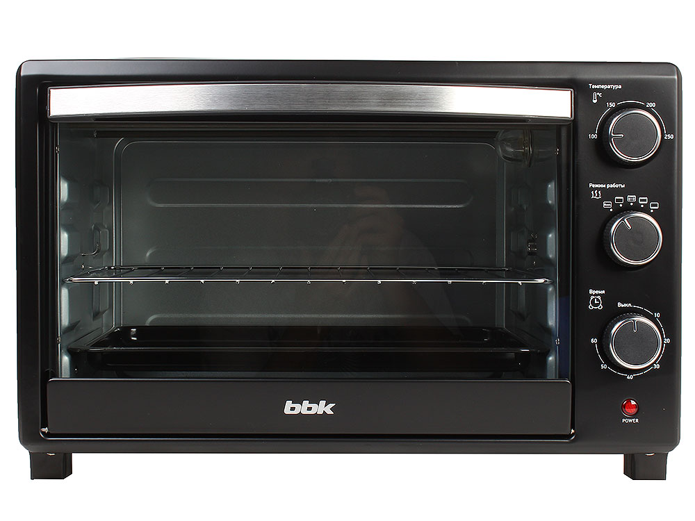 Mit dem ersten können Sie eine Temperatur von 100 bis 240 C wählen. Mit dem zweiten können Sie den gewünschten Modus der sechs verfügbaren einstellen, einschließlich Auftauen, Konvektion und Grillen. Mit Hilfe des dritten wird die geplante Abschaltzeit eingestellt, die 15 - 120 Minuten beträgt.Der eingebaute Thermostat steuert die Wärme in der Kammer und schaltet die Heizelemente oben und unten ein und aus.