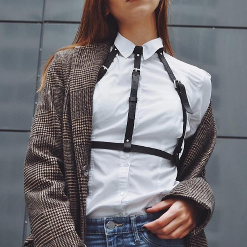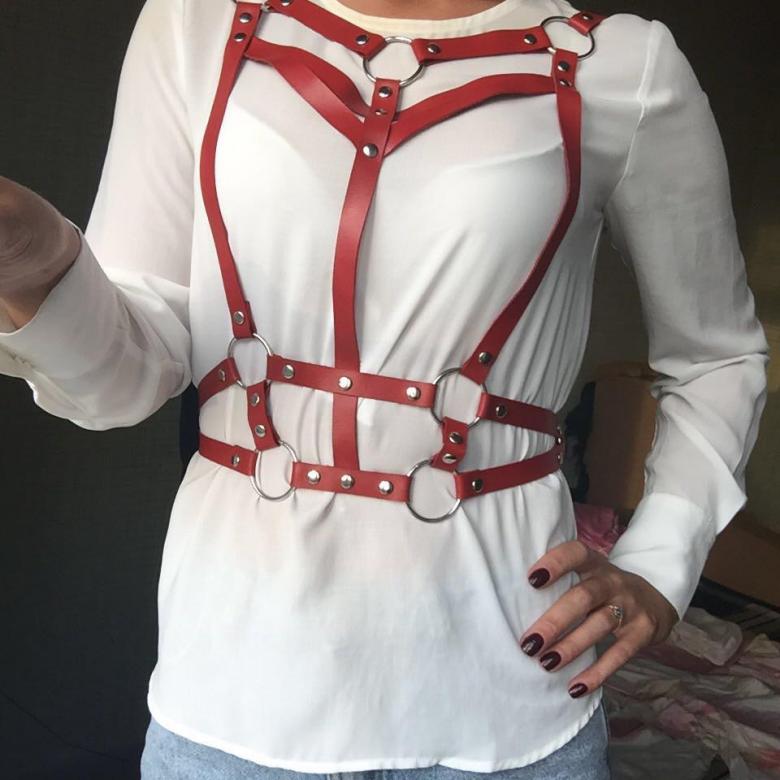 Es besteht aus breiten Bändern, die ineinander verschlungen sind. Die Gürtel sind mit kleinen Nieten und Ringen verziert. Das Accessoire sieht gut aus mit Hosen und einem strengen Kleid. Wird die perfekte Ergänzung für mutige Mädchen sein. Die Träger sind je nach Brustumfang und individuellen Eigenschaften der Figur verstellbar.
