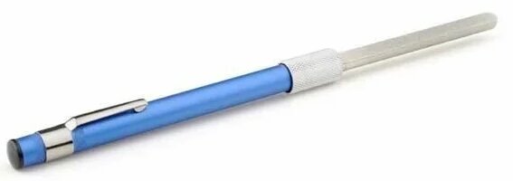 Die Pocket-Version ist wie ein Kugelschreiber gefertigt und mit einer blauen Kappe verschlossen. Es gibt silberne Elemente: Befestigung in Form einer Halterung, Spannzange.