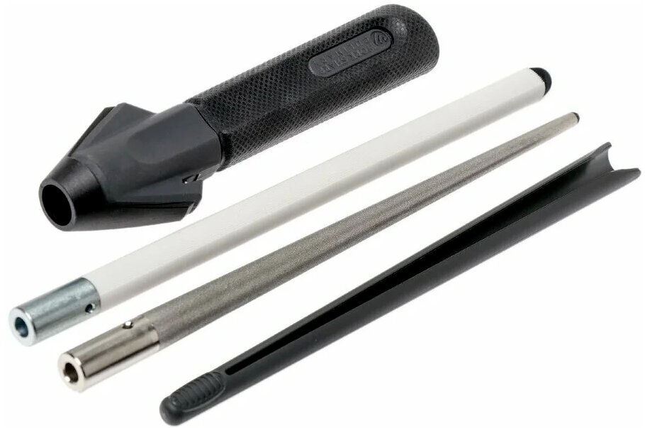 Die Stange wird durch eine Spannzange im Körper fixiert, hat zwei Arbeitszonen (zylindrisch, kegelförmig). Kegelförmiger Teil - gezackte, gezackte Oberflächen. Die halbkreisförmige Diamantfeile enthält eine Rille (Angelhaken).