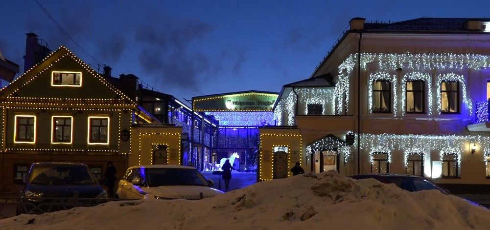 Blick auf die Fassade des Hotels Tatarskaya Usadba im Winter