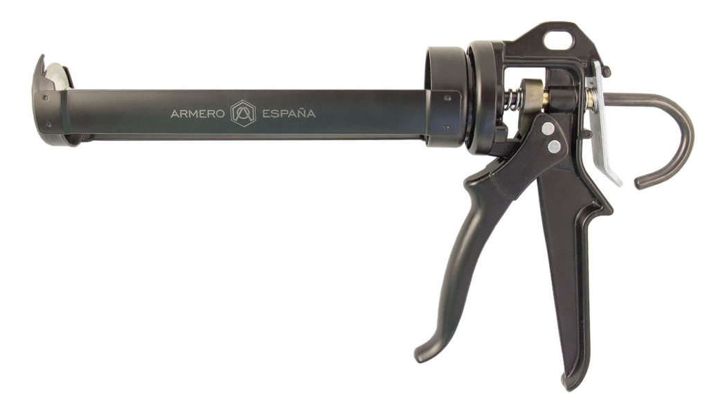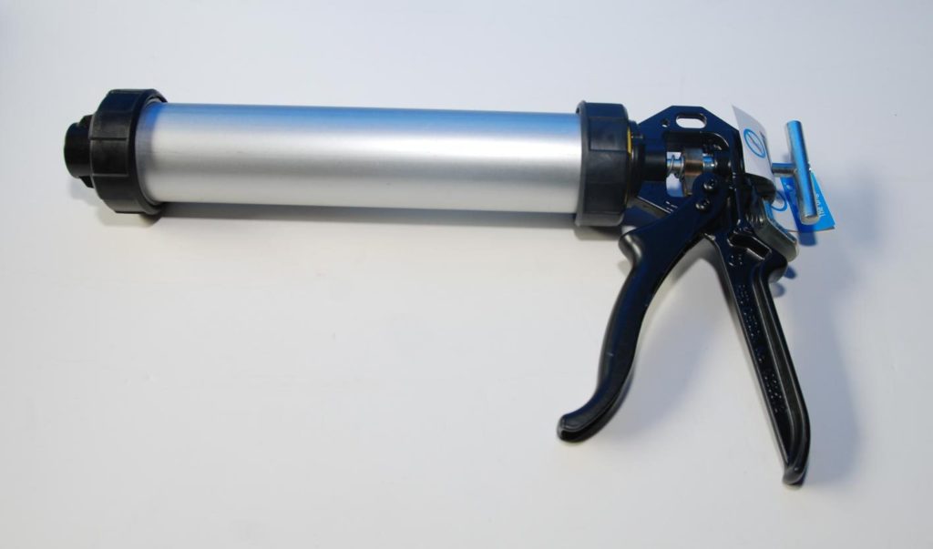 Die erste Unterart wird hauptsächlich zur einmaligen Versiegelung verwendet.Sie gilt im Vergleich zur Halbkonstruktion als langlebiger. Die Kosten für ein solches Gerät sind etwas höher. Der Skeletttyp der Pistole ist mit einem starren Rahmen ausgestattet. Es hält einen runden Behälter mit Klebstoff gut. Das im Produkt verbaute Kolbensystem arbeitet sehr zuverlässig. Die Waffe besteht aus Metall mit einer Dicke von 1,5 mm. Die Kolbenstange ist aus Eisen. Sein Durchmesser beträgt etwa 6 mm.