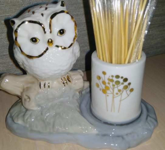 Chinesische Handwerker bieten einen Ständer in Form eines Fasses an, neben dem eine Eule sitzt. Das Design ist aus weißem Porzellan. Ein schönes kleines Modell mit einer schönen Bemalung passt kompakt in die Küche. Zerbrechliches Porzellan erfordert sorgfältige Pflege. Es wird nicht empfohlen, in der Spülmaschine zu waschen, fließendes Wasser ist besser. Gewicht und Abmessungen: 220 g; 6,5 x 9,5 x 12,5 cm.Der Preis beträgt 1000 Rubel.