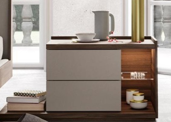 Das funktionelle Modell des berühmten italienischen Möbelhauses mit modernem Design fügt sich perfekt in jedes Schlafzimmer ein. Es wird nicht nur viele wichtige Gegenstände unterbringen, sondern auch den Raum schmücken. LED-Nischenbeleuchtung mit Glasregal fügt Originalität und Komfort hinzu. Es gibt ein offenes Regal zur bequemen Aufbewahrung sowie zwei Schubladen mit Soft Closer für geräuschloses Schließen. Montiert auf einer Plattform mit unauffälligen Beinen lässt er sich leicht im Raum bewegen. Eine bequeme große Tischplatte mit einer doppelseitigen Kante um den Umfang ermöglicht es Ihnen, das Produkt als Nachttisch oder Schreibtisch zu verwenden.