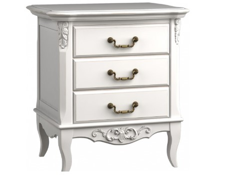 Ein eleganter weißer Nachttisch mit anmutigen Beinen, geschnitzten dekorativen Elementen der Fassade und schmiedeeisernen Schubladengriffen wird eine echte Dekoration eines klassischen, gotischen oder barocken Schlafzimmers sein. Auf der Oberfläche des Gehäuses wird eine Lampe oder ein Foto, das Ihnen am Herzen liegt, in einem Rahmen, der dem allgemeinen Stil entspricht, großartig aussehen. Drei kleine, aber geräumige Schubladen verstecken alle notwendigen Kleinigkeiten.